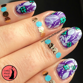 Today I have a gorgeous look I whipped up over Picture Polish Imperial. I stamped this fab leaves image from Bundle Monster over two easy coats of Imperial in Konad White. Then I dotted on the teal flower petals and outlined in black acrylic. I only added a few flowers for the POP of color, but I just loved the look. I also matted the whole thing.